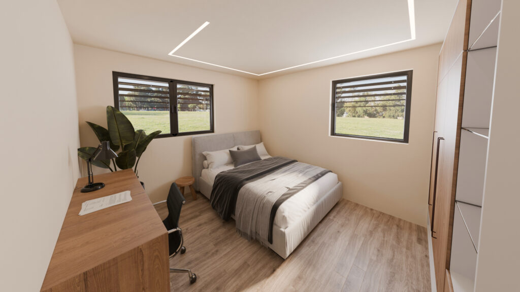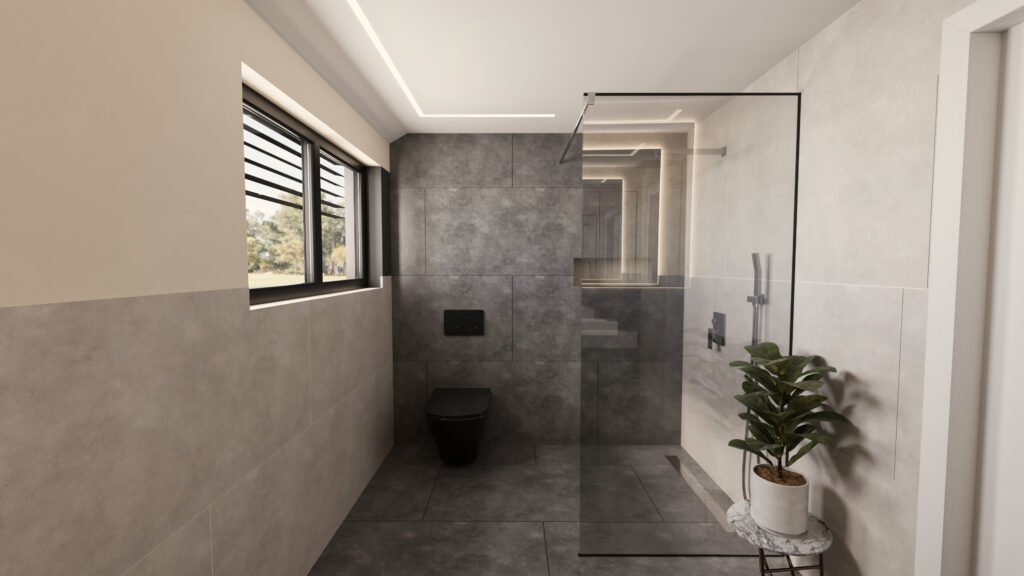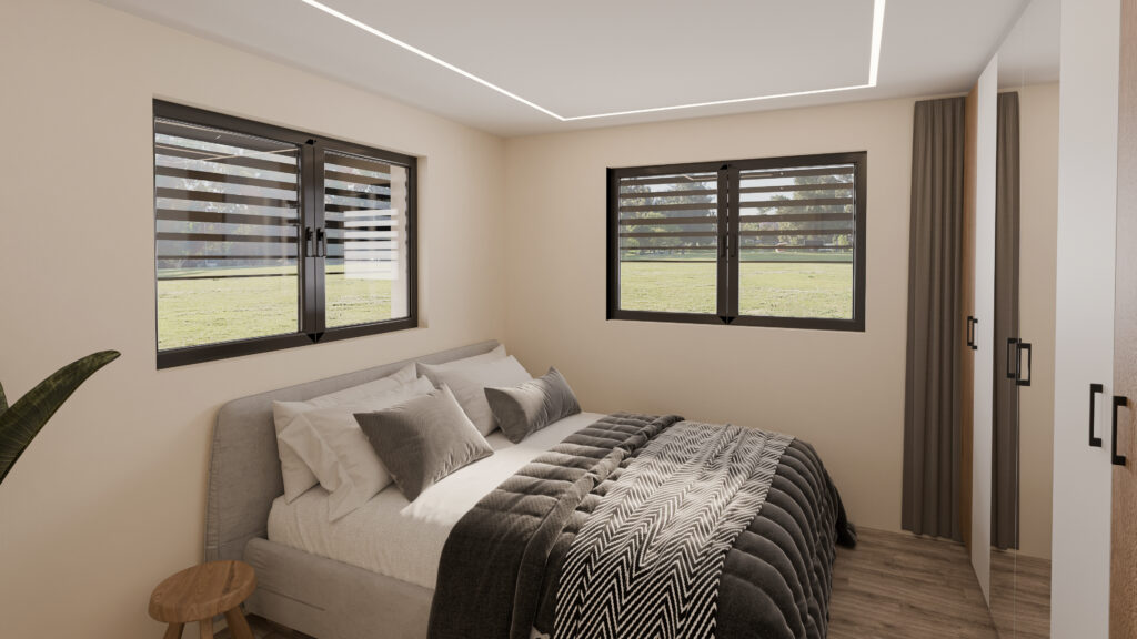 sowie ein Bad/WC und einen praktischen Abstellraum. Besonders einladend ist die überdachte Terrasse, perfekt für gemütliche Abende im Freien und Grillen. Der Flur bietet ausreichend Raum, um ihn als Garderobe zu nutzen.