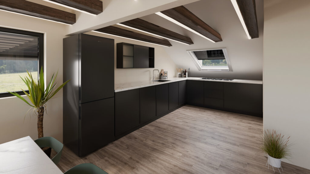 Die Dachgeschosswohnung besticht durch ihre 3,5 Zimmer, die sich wie folgt aufteilen: ein gemütliches Kinderzimmer, ein geräumiges Schlafzimmer, ein Badezimmer sowie ein offenes Wohnzimmer, das harmonisch in den Essbereich übergeht.