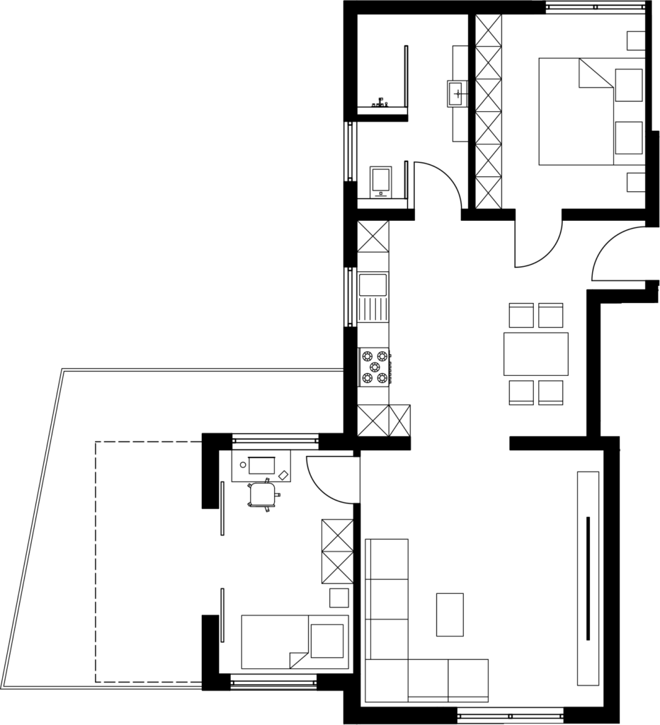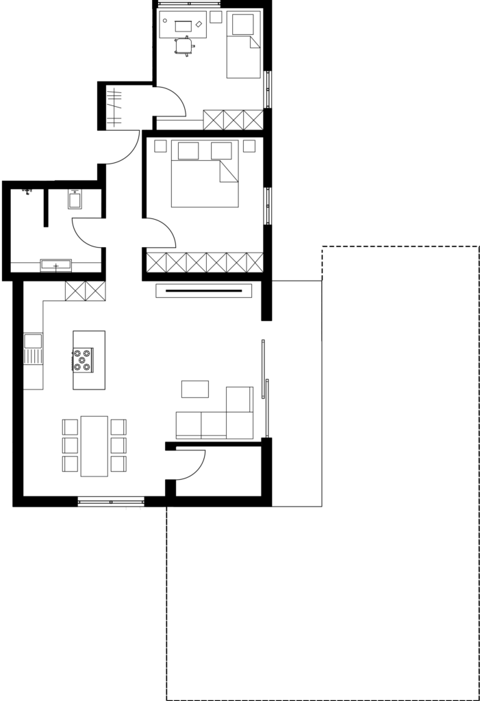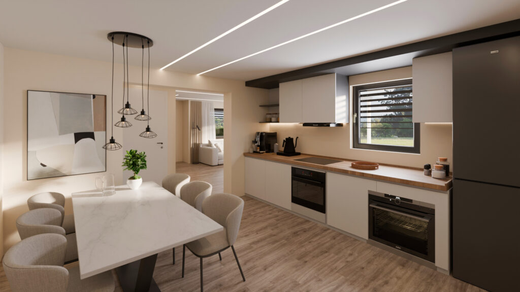 Die zweite Erdgeschosswohnung mit 3,5 Zimmern überzeugt durch ihre durchdachte Raumaufteilung und bietet genügend Platz für eine Familie. Sie umfasst ein Schlafzimmer, Kinderzimmer, Wohnzimmer, Küche mit integriertem Essbereich
