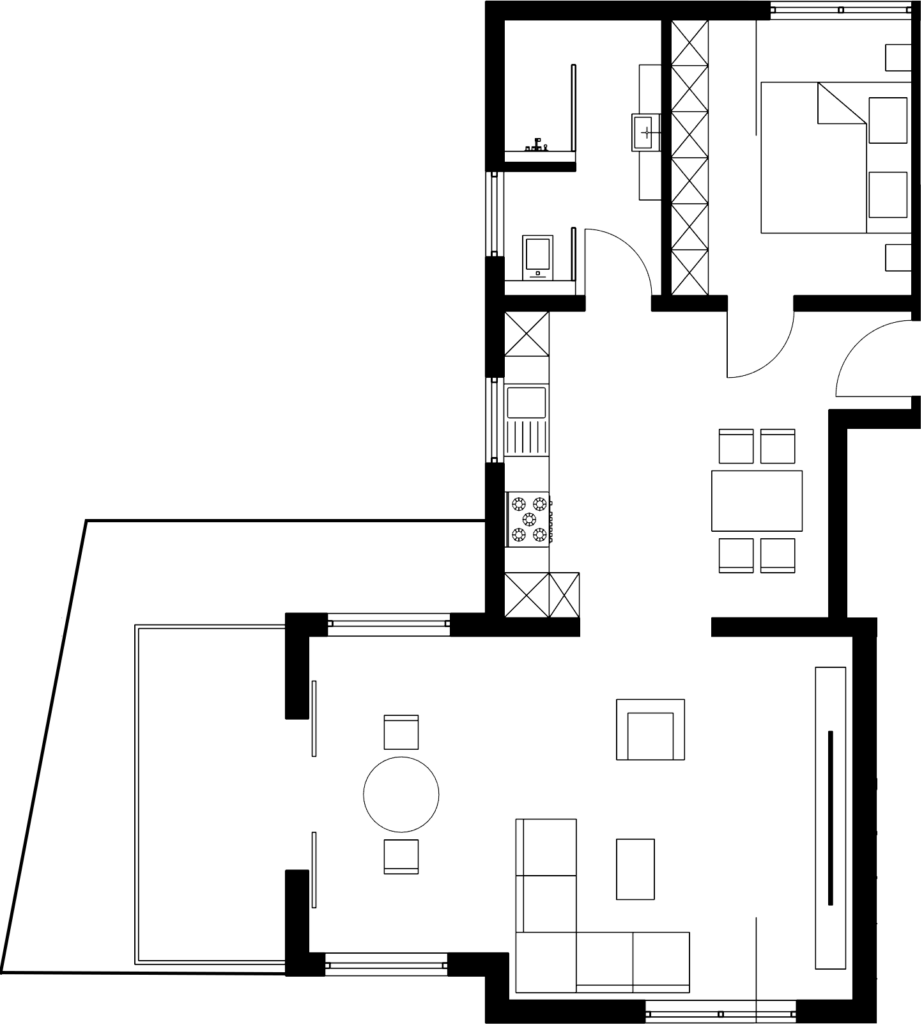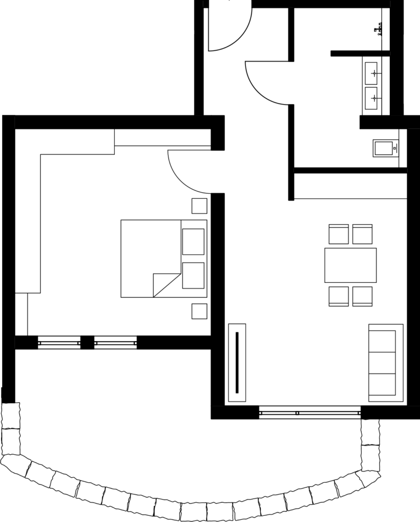 Küche und ein Bad. Trotz ihrer kompakten Größe bietet sie alles, was man für ein angenehmes Wohnen benötigt. Die Wohnung verfügt außerdem über eine schöne Terrasse bzw. einen Lichthof.